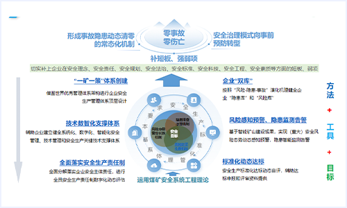 煤礦安全生產(chǎn)保障支撐體系是充分研究借鑒國(guó)際通用的安全管理體系架構(gòu),以國(guó)家法律法規(guī)、技術(shù)標(biāo)準(zhǔn)為基礎(chǔ),運(yùn)用煤礦安全系統(tǒng)工程理論,構(gòu)建以安全目標(biāo)為引領(lǐng),風(fēng)險(xiǎn)分級(jí)管控、隱患排查治理和風(fēng)險(xiǎn)防范化解三大機(jī)制構(gòu)建為核心,以安全生產(chǎn)標(biāo)準(zhǔn)化管理體系基本要求為主線,通過體系、雙庫建設(shè)的方式方法,借助安全、技術(shù)等數(shù)智化保障支撐工具,實(shí)現(xiàn)安全生產(chǎn)責(zé)任制全面落實(shí)、標(biāo)準(zhǔn)化動(dòng)態(tài)達(dá)標(biāo)的目標(biāo)。切實(shí)補(bǔ)上煤礦在安全管理方面的短板、弱項(xiàng),最終實(shí)現(xiàn)“零事故、零傷亡”的宏偉目標(biāo)。