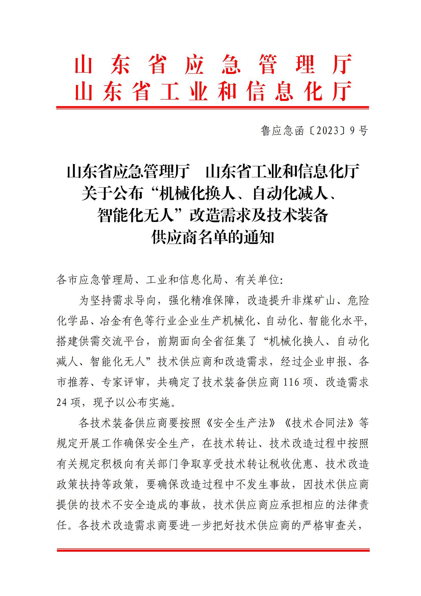 山東精誠電子科技有限公司入圍“山東省應(yīng)急管理廳 山東省工業(yè)和信息化廳“機(jī)械化換人、自動化減人、智能化無人”改造需求及技術(shù)裝備供應(yīng)商”